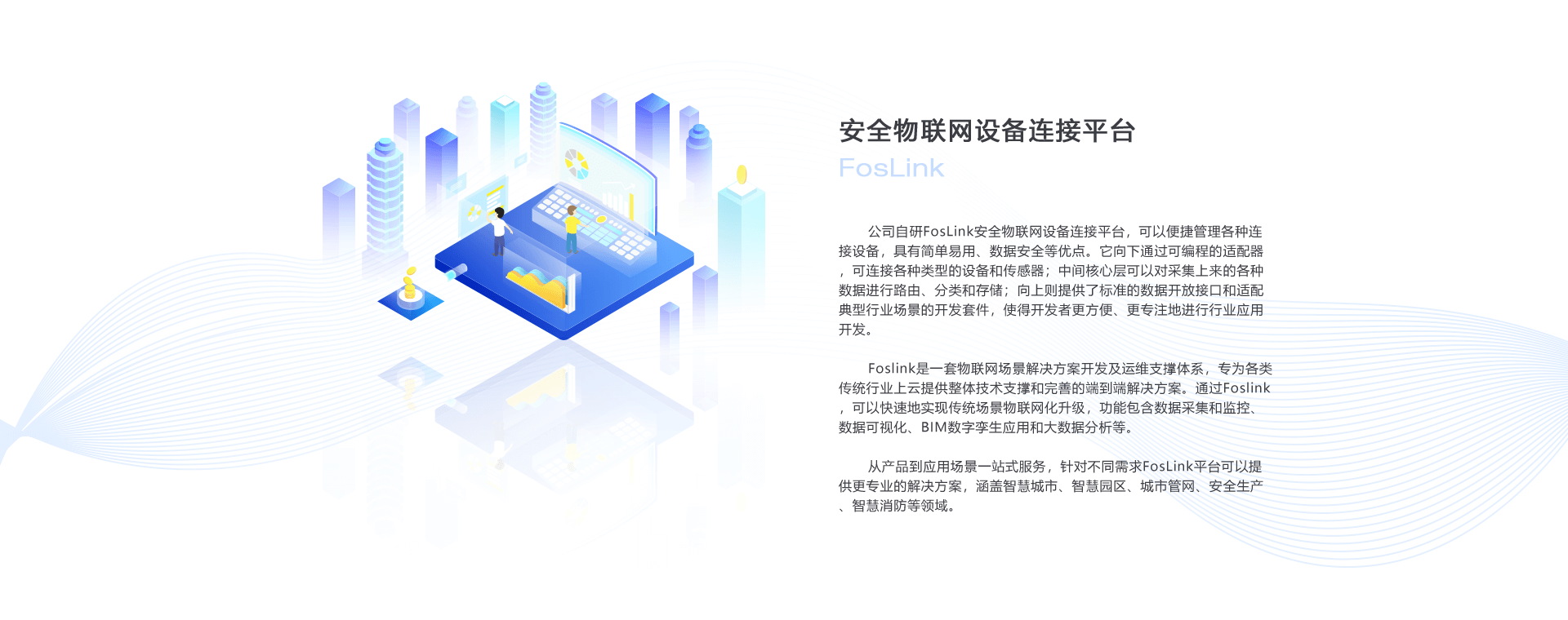 公司自研FosLink安全物聯(lián)網(wǎng)設(shè)備連接平臺(tái),可以便捷管理各種連接設(shè)備,具有簡(jiǎn)單易用、數(shù)據(jù)安全等優(yōu)點(diǎn)。它向下通過(guò)可編程的適配器,可連接各種類型的設(shè)備和傳感器;中間核心層可以對(duì)采集上來(lái)的各種數(shù)據(jù)進(jìn)行路由、分類和存儲(chǔ);向上則提供了標(biāo)準(zhǔn)的數(shù)據(jù)開(kāi)放接口和適配典型行業(yè)場(chǎng)景的開(kāi)發(fā)套件,使得開(kāi)發(fā)者更方便、更專注地進(jìn)行行業(yè)應(yīng)用開(kāi)發(fā)。
